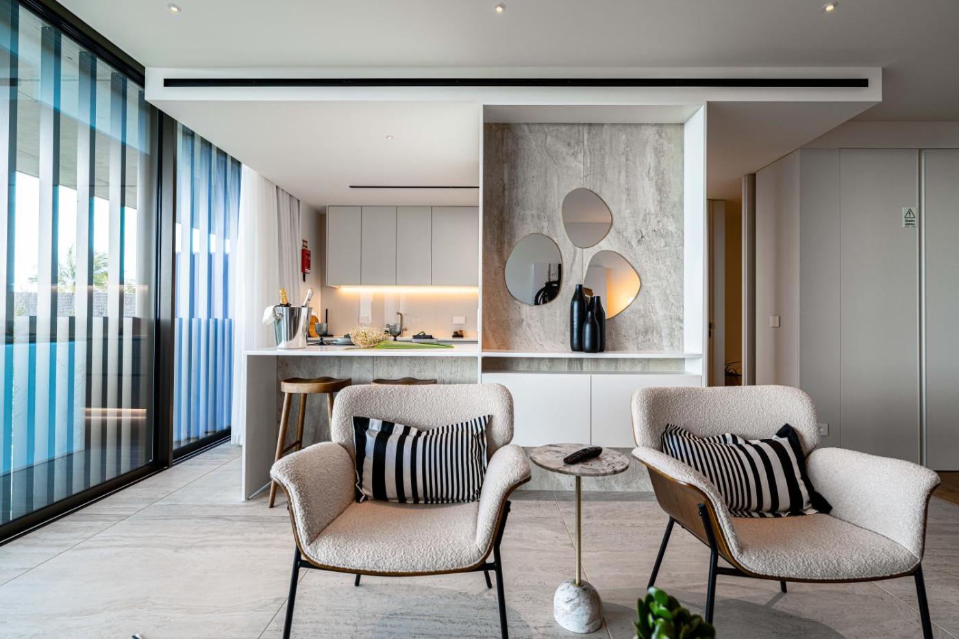 Deluxe One-Bedroom Apartment with Ocean and Garden View. Guests will have a special experience as this apartment provides a pool with a view. Featuring a private entrance, this air-conditioned apartment is comprised of 1 living room, 1 separate bedroom and 2 bathrooms with a walk-in shower and a bidet. The well-equipped kitchen features a stovetop, a refrigerator, a dishwasher and kitchenware. The spacious apartment offers a washing machine, soundproof walls, a tea and coffee maker, a flat-screen TV with cable channels, as well as sea views. The unit offers 2 beds.