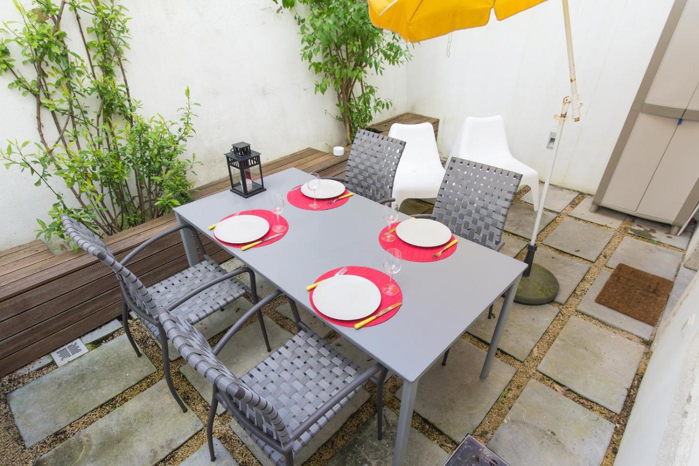 The apartment with a terrace andcourtyard views has 1 bedroom, a living room, a flat-screen TV, an equipped kitchen with a dishwasher and an oven, and 1 bathroom with a walk-in shower. Towels and bed linen are offered in the apartment. The property has an outdoor dining area.