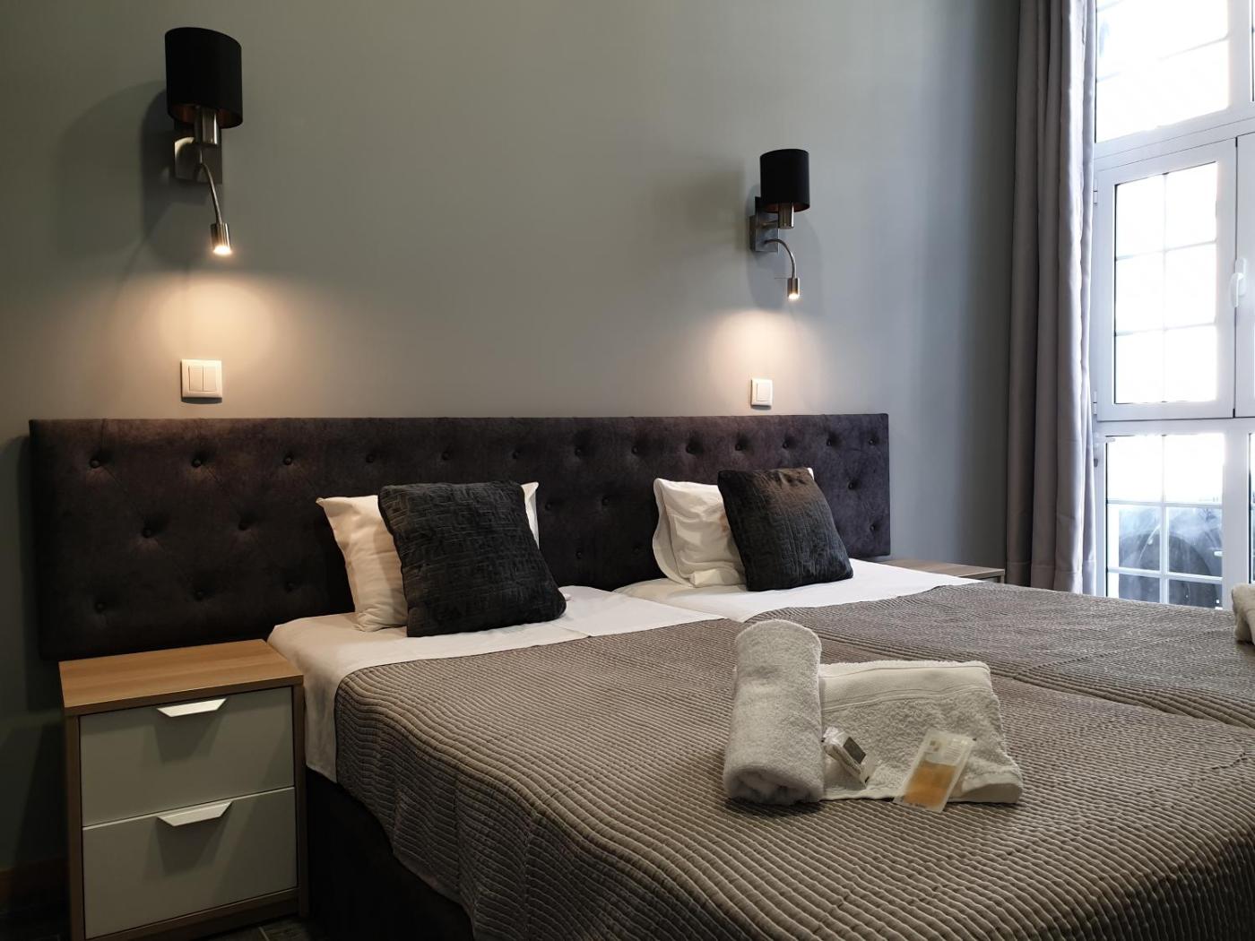Twin Room. Featuring large windows and tiled floors, this simply furnished room comes with a cable TV and a private bathroom. ;